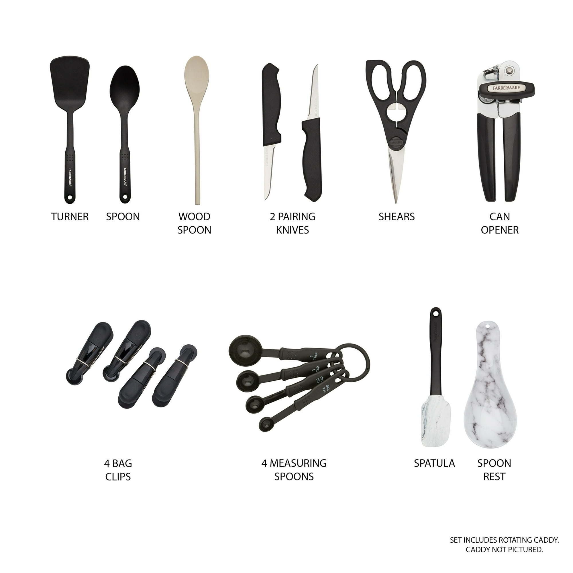 Set includes rotating caddy, can opener, spoon rest, 4 bag clips, shears, silicone spatula, 2 paring knives, wood spoon, nylon spoon, nylon turner, and 4 measuring spoons.