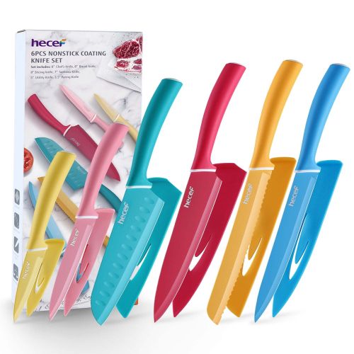 All knives in one set: Hecef 6-piece multicolor knife set includes chef knife, bread knife, carving knife, santoku knife, utility knife and paring knife with matching knife sheaths. The colored coating helps to differentiate the utility of each knife. You can use them to cut meat, vegetables, bread, sandwiches and fruits. One set could meet all your kitchen-cutting needs.