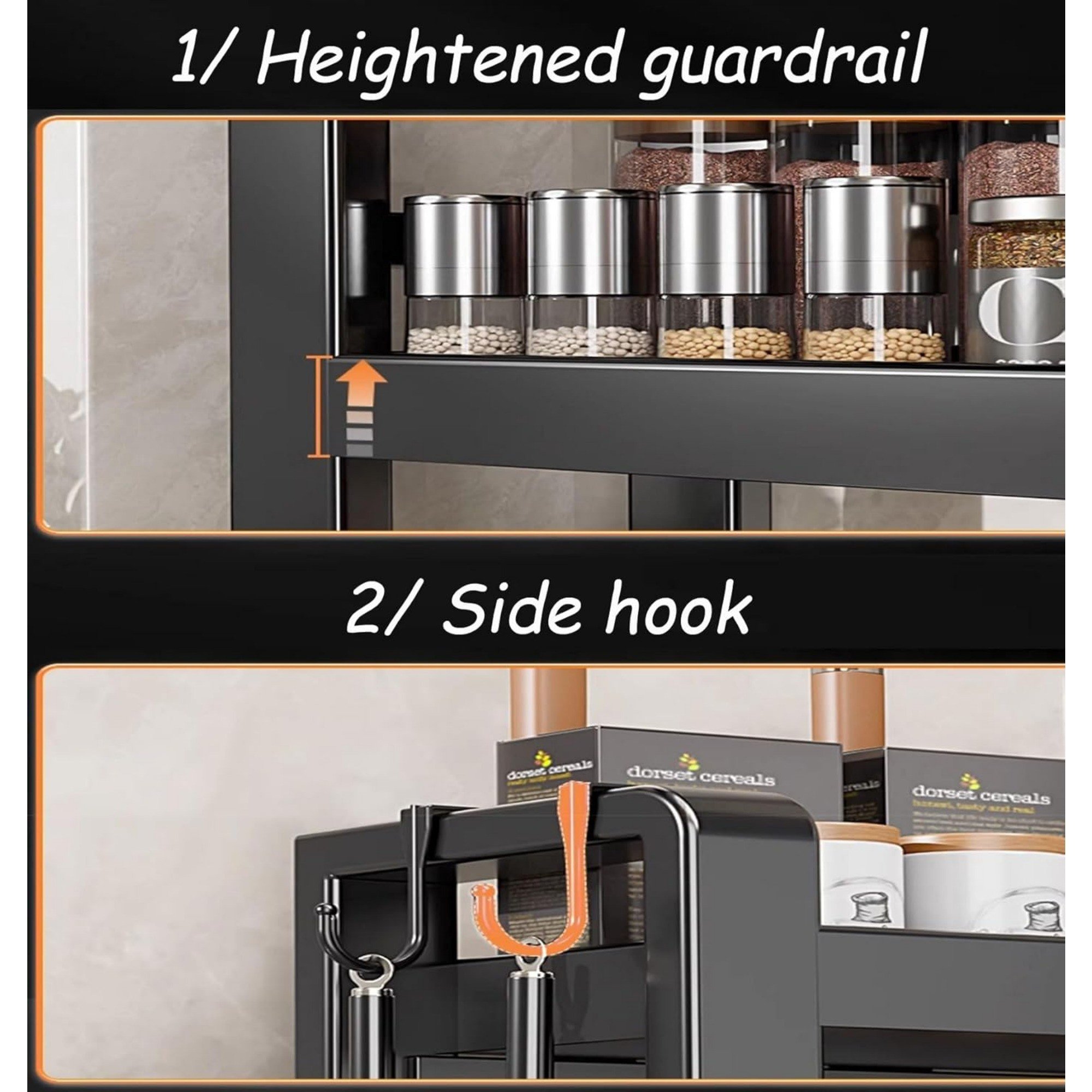 Multi-Layered Storage: This 3-tier kitchen seasoning rack provides ample space to neatly organize your seasonings, utensils, and cutlery. Maximize your countertop space efficiently.Versatile Organization: Not only for seasonings, but also suitable for holding pots, lids, and cutting boards. The hooks offer additional storage for small items like towels or spoons.Stylish and Practical: The black finish adds a modern and sleek look to your kitchen. It blends well with any decor while keeping your kitchen essentials organized.Sturdy and Durable: Made from high-quality materials, this rack is built to last. It can withstand the weight of your kitchen items without sagging or breaking.Easy Access and Visibility: The open design allows for easy access to your items and clear visibility, making it convenient to find what you need quickly while cooking.