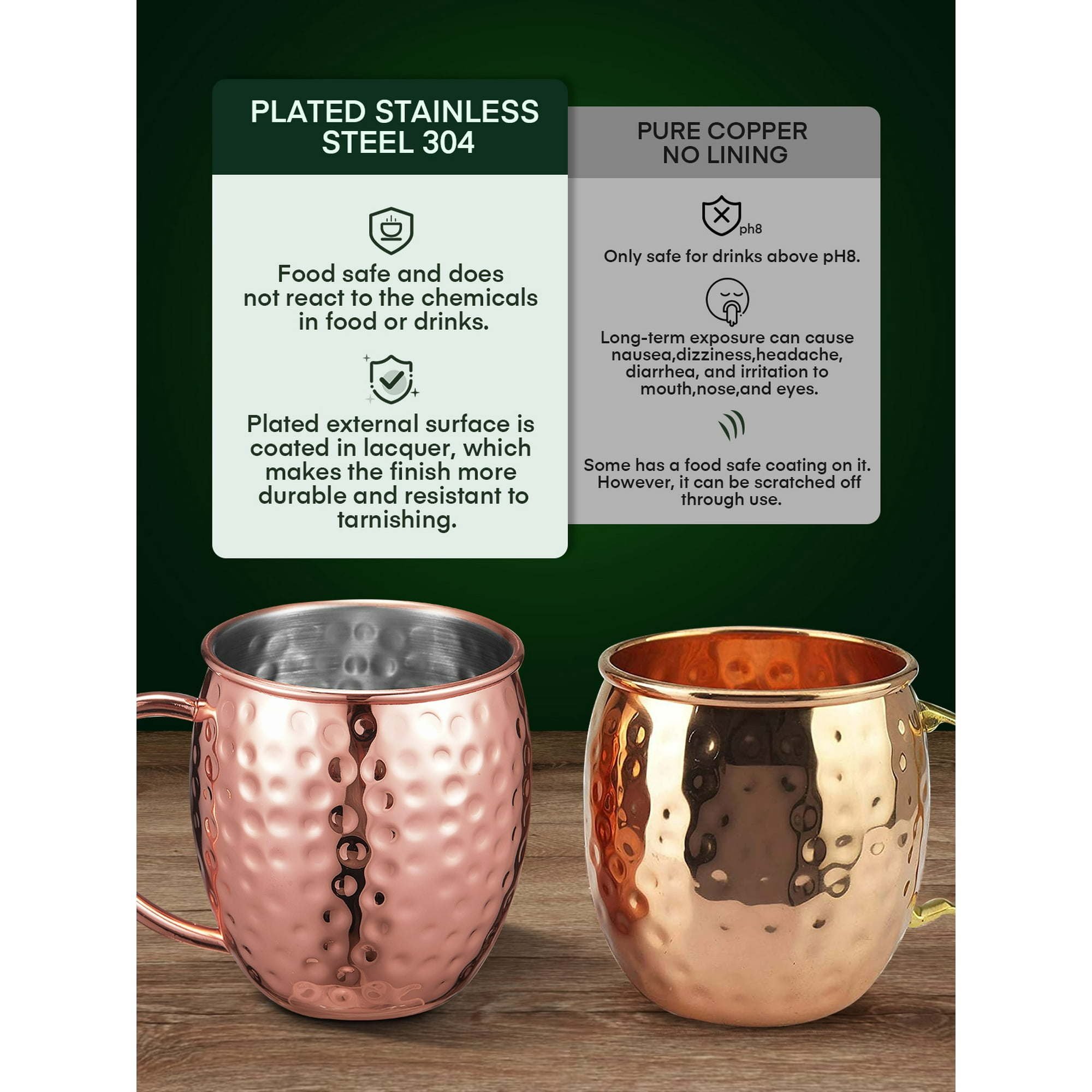 100% stainless steel lining to prevent discoloration. Copper exterior is protected with a proprietary food grade lacquer to help it withstand tarnish, rust or stain. Safe for all drinks both alkaline and acidic unlike copper!