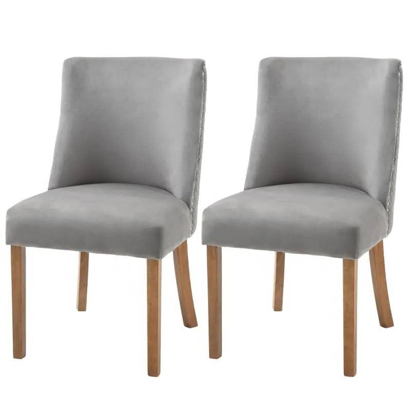 Create a stylish and cozy dining area with this Grey Modern High Back Nail Head Trim Upholstered Dining Chairs, Set of 2! Includes 2 chairs that can be used for having dinner, a conversation for two or accent chairs in your home. Chairs include a high backrest and wood legs for a modern and contemporary design that complements your home décor. Use in the kitchen, dining room, bedroom, office, and more. Sit back and sink into these upholstered accent chairs! The chairs covered with velvet-touch polyester fabric offer good breathability. Includes a high back and a sponge padding seat for added comfort and support while you lounge. The dining room chairs are suitable for daily use. All four legs are made with solid wood construction for a stable seating area.