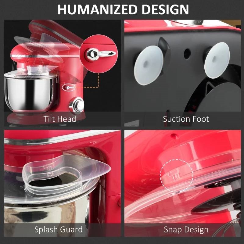 This Red Stainless Steel Tilt 600W Electric Mixer 6QT is designed with a high-performance 600W pure copper motor and multiple speed choice to more effectively knead dough and beat eggs, this food mixer provides versatility for frosting, creamy dressings, dough, and baked goods. This standing mixer has a 6-level speed ranging from low to high, providing options to knead gently and thoroughly mix,. Press the 'P' button to mix at the fastest speed in a short time. This stand mixer's 6qt mixing bowl lets you make two dozen cookies or four loaves of bread in a single batch. It also includes a dough hook, beater, and whisk to expand your culinary options. The tilt-head design allows less mess when changing out accessories. The suction cups under the bottom provide excellent stability. NOTE: Don't forget to put the bowl cover on top before turning it on.