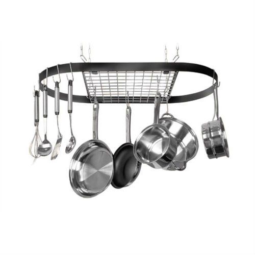 This Ceiling Mount Wrought Iron Hanging Oval Pot Rack with 12 Hooks holds 40 lbs. of cookware. Wrought-iron construction is attractive and durable. Heavy-gauge chrome center grid holds additional hooks. Includes 12 hooks and hanging hardware. Protected by 5-year limited warranty. 5 year limited warranty.