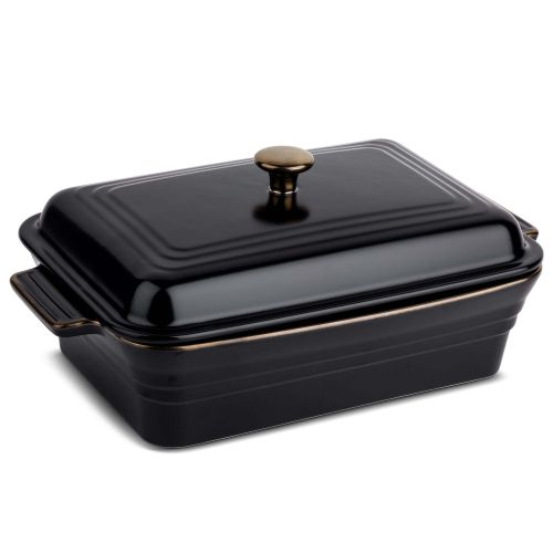 Thyme & Table Easy Clean 13 inch Covered Stoneware Baking Dish, Onyx is the ultimate baking tool. Made for those who demand elegance and sophistication in their kitchen. Crafted from high-quality materials. This baking dish is designed to last and built to impress. Its sleek and sophisticated black exterior is not only aesthetically pleasing. But also functional, as it helps to distribute heat evenly for perfectly baked dishes. For care & ensuring the product's longevity, please hand wash in warm water with a soft sponge and dish soap.