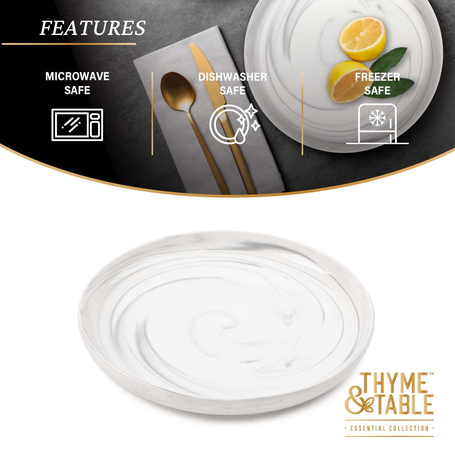 Thyme & Table Grey Marble Stoneware Round Dinner Plate is a part of the Thyme & Table Marble Collection. The dinner plate is microwave, dishwasher, and freezer safe. Oven safe up to 428 degrees. Promises to deliver utility and elegance