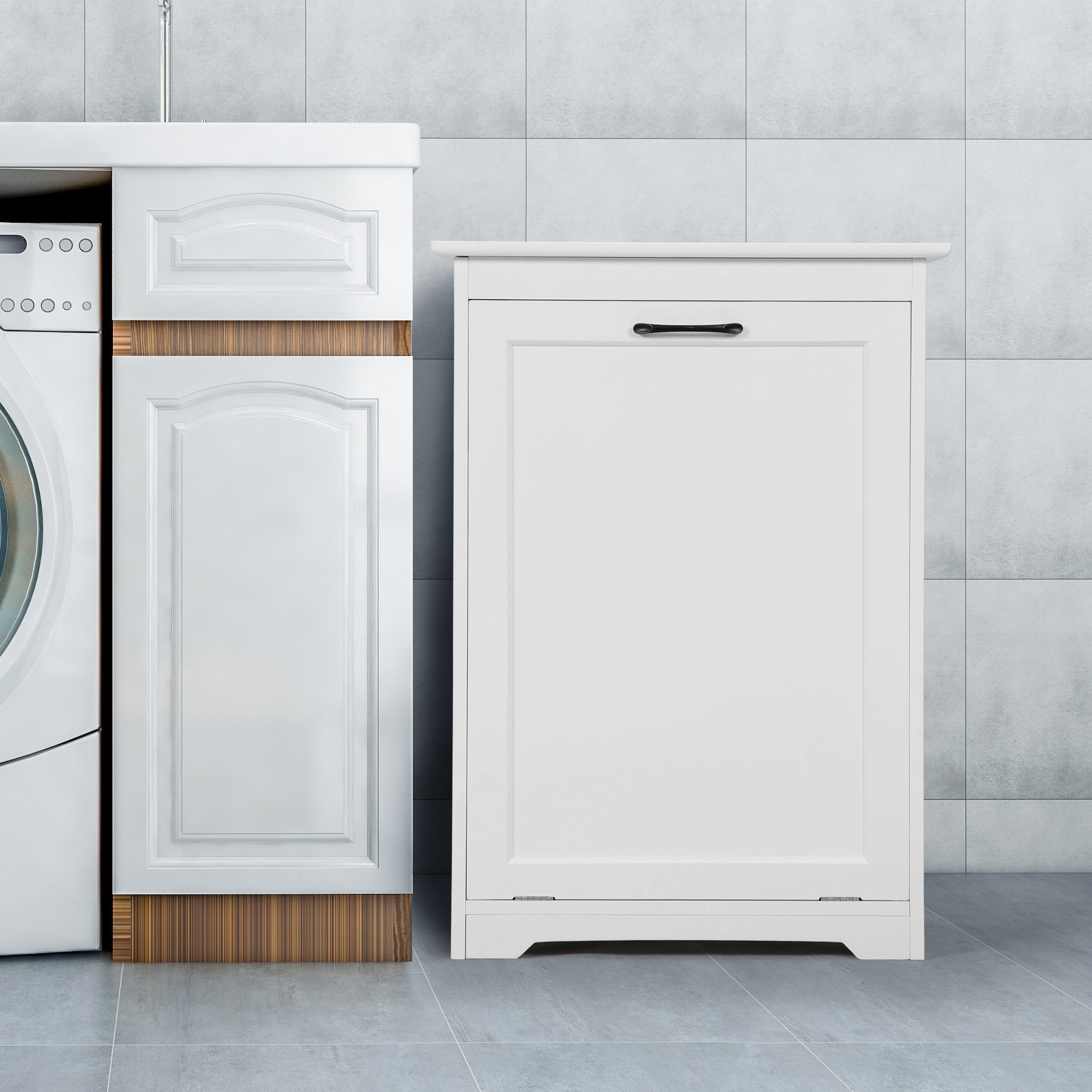 [Thoughtful Design]: To improve the stability of the trash can cabinet and make it convenient to open the door; the anti-dump device and metal handle are thoughtfully designed.